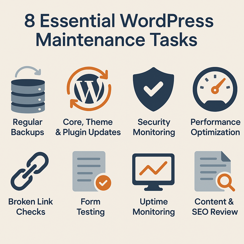 To continue our WordPress Support Services theme we are going to go over 8 tasks for successful upkeep. We went over 4 key WordPress support focus areas, click here, that covered 4 areas you should focus to properly maintain your website. As part of any WordPress maintenance plan for your business you should include the following tasks that should be done on a regular basis: